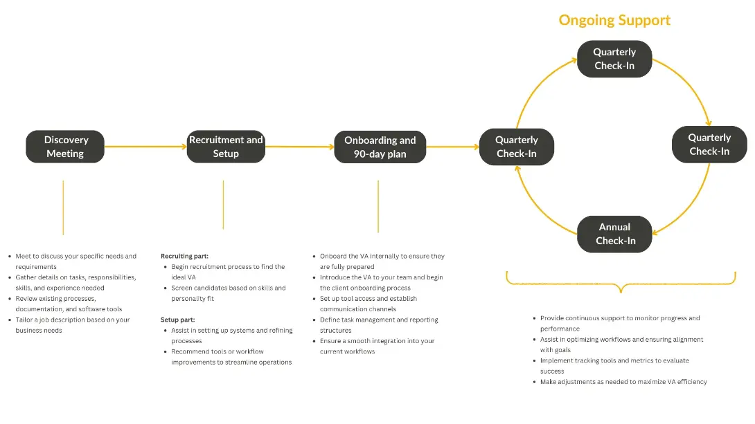 Once your VA is onboarded, our work doesn't stop there. We provice continuous support to monitor progress, optimize workflows and make sure everything runs smoothly. We also help implement tracking tools and metrics so you can evaluate the VA's performance and make any necessary adjustments.
